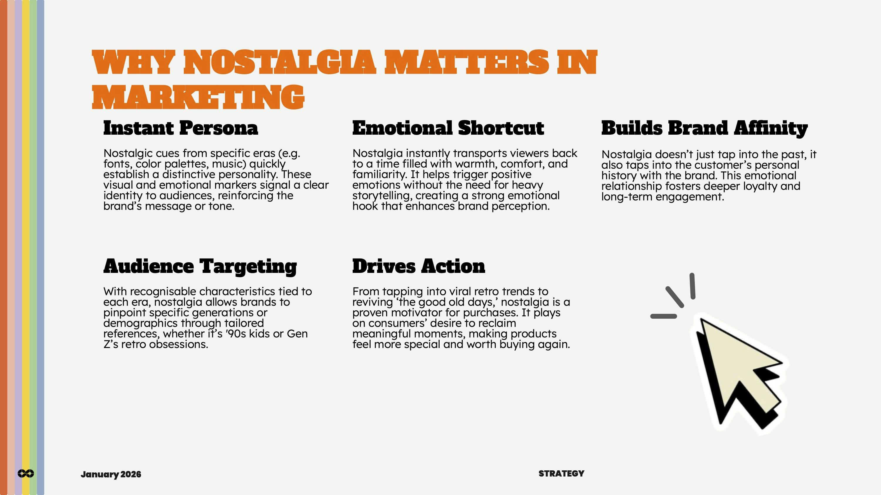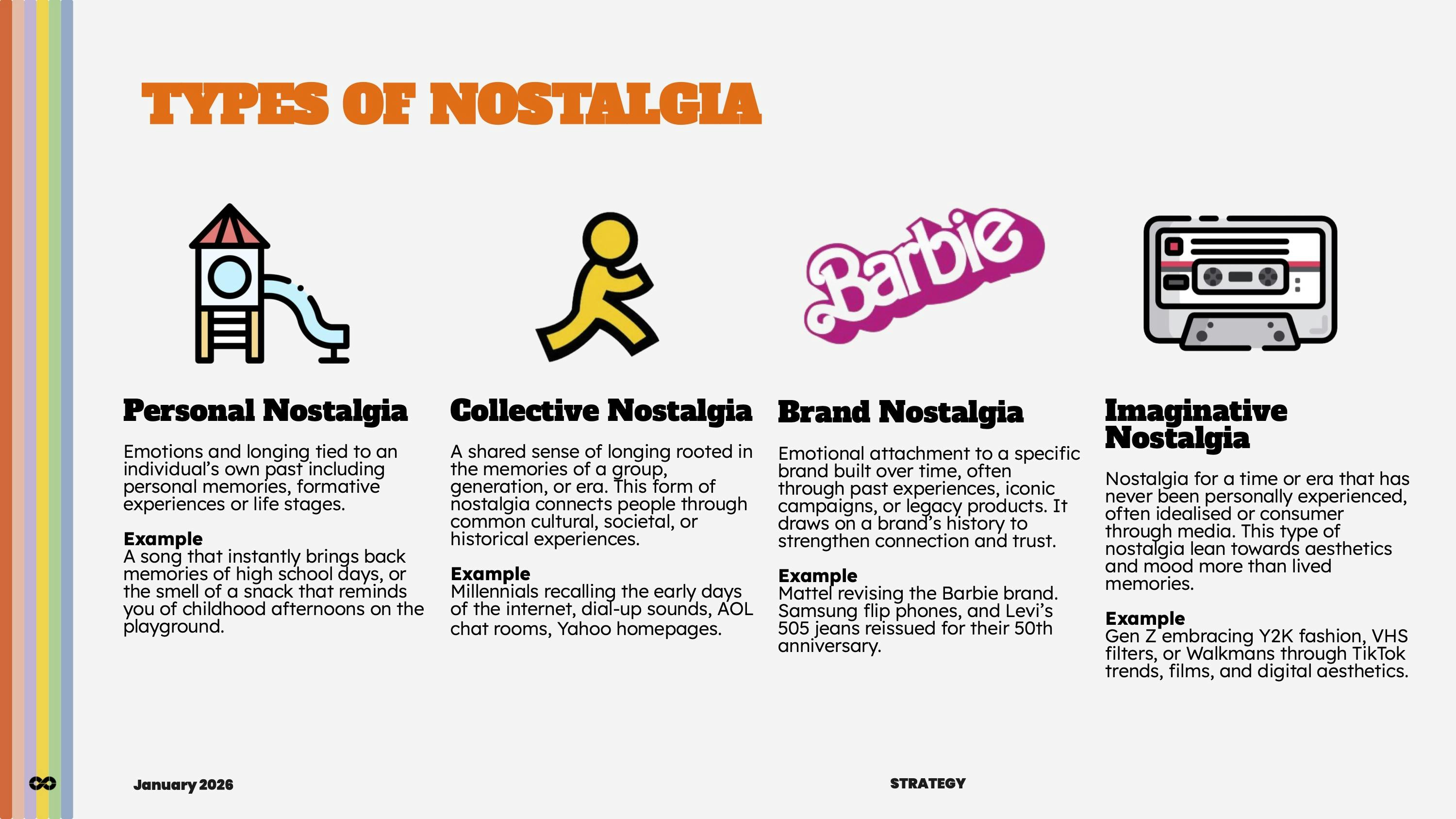 In the deck, the team unpack why nostalgia resonates so deeply, the different forms it can take, and how brands can use it to drive relevance, emotional connection, and real commercial value.