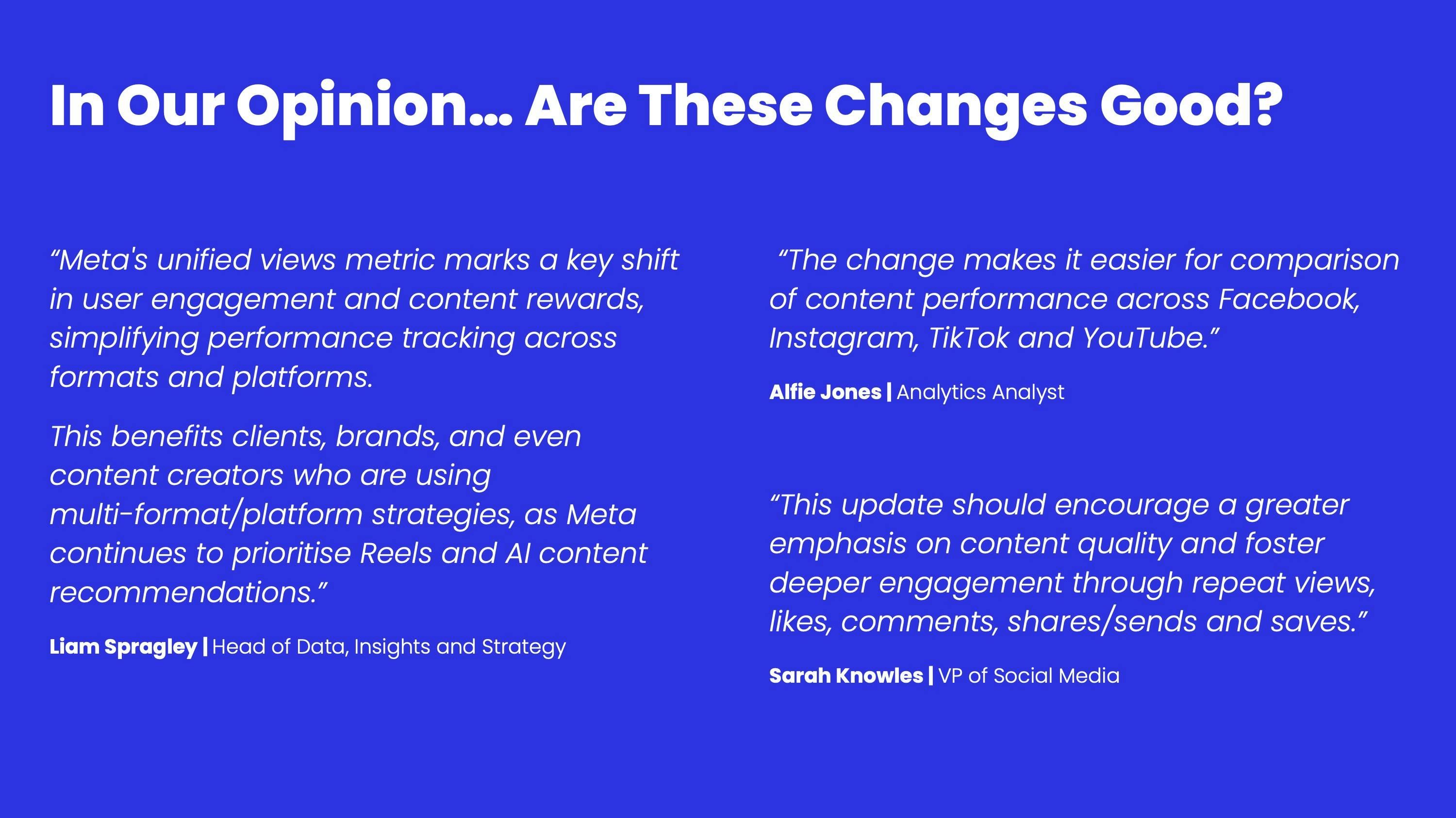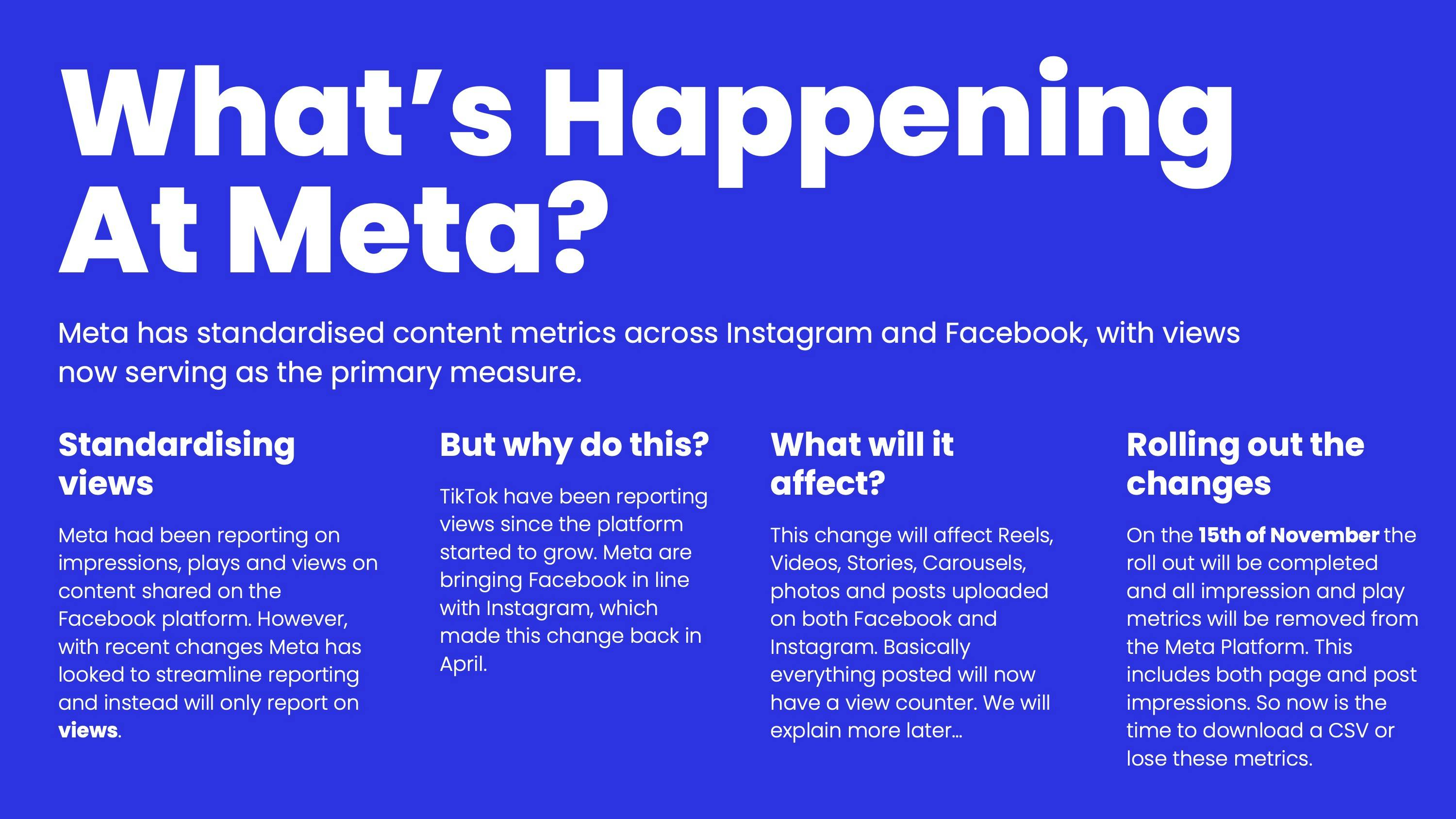 As Meta standardises the reporting across Instagram and Facebook, there's a major change: Impressions and Plays are being removed and replaced solely with Views. How will this impact your metrics, averages, and reporting? The Data Insights and Strategy team has created a helpful guide to make these changes easier to understand.